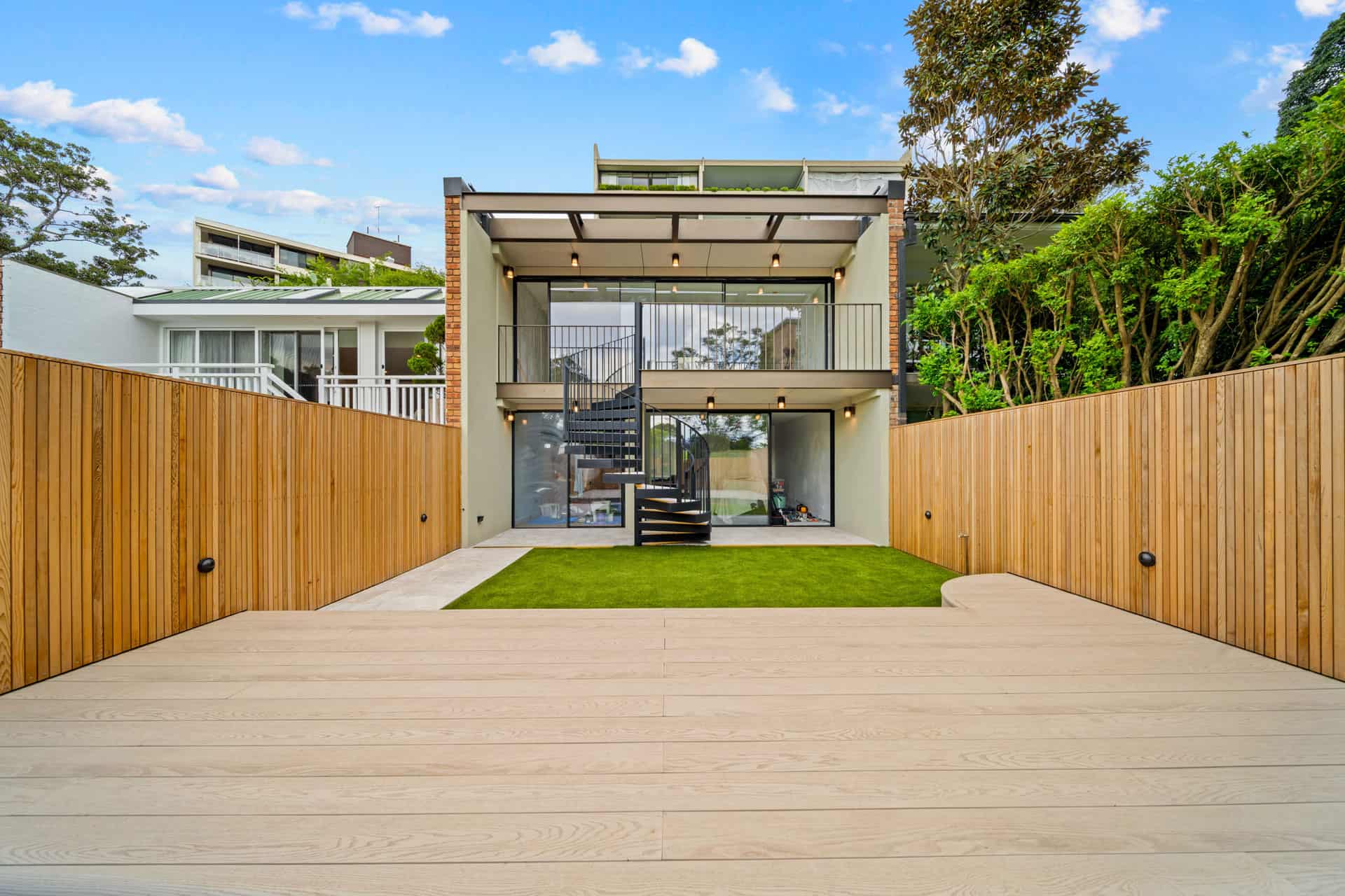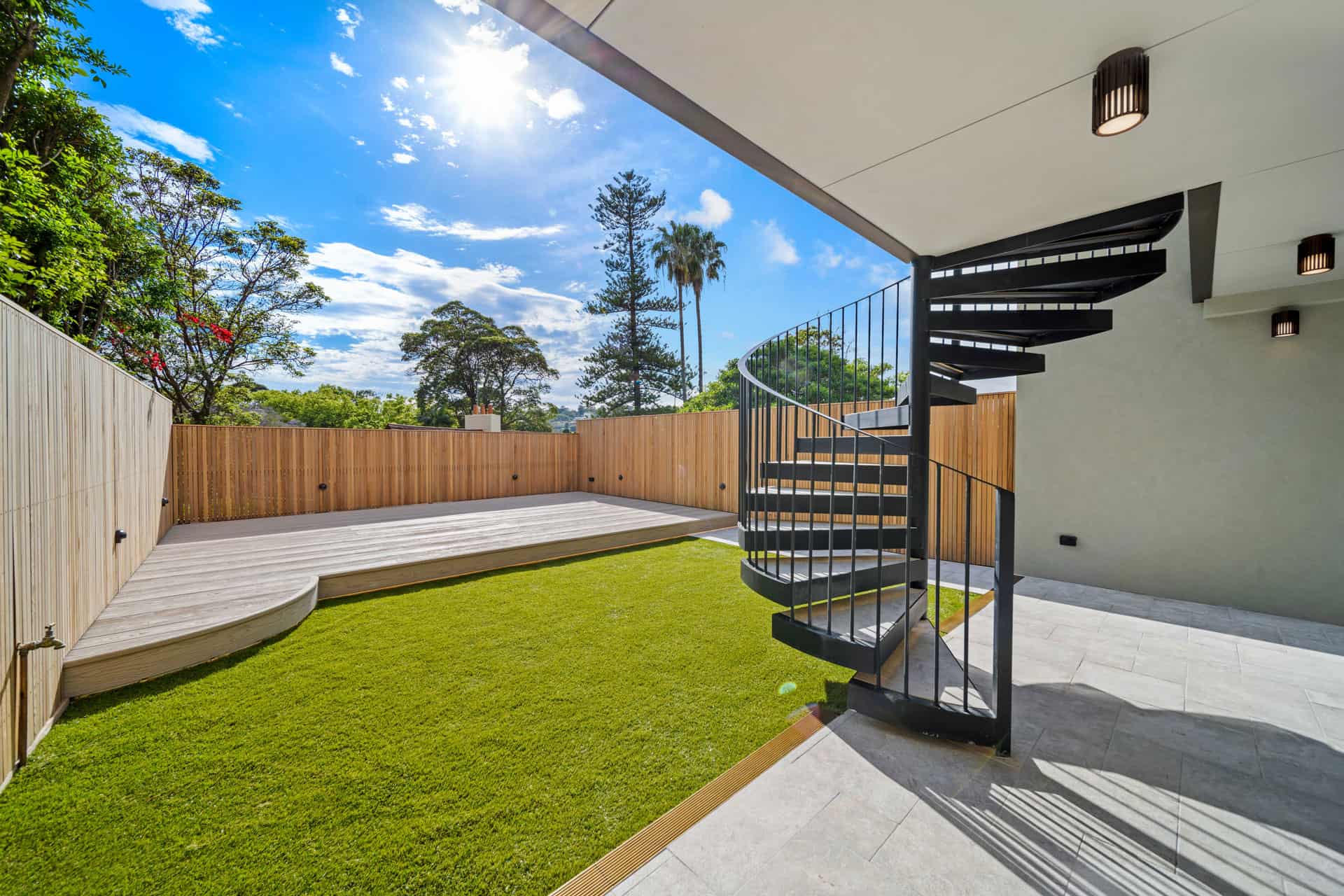 And another centre piece was the custom spiral staircase with travertine inserts that leads up to the balcony, linking the upper level back down to the outdoor entertaining area. Throughout the project we combined natural stone, composite decking and cedar timber, bringing together materials designed to handle the outdoors while keeping the space balanced and refined. The result is a backyard designed to be used and enjoyed.